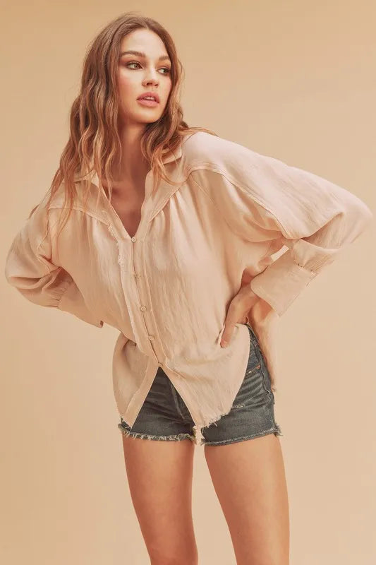 Aemi + Co Raw Hem Button Down Raglan Sleeve Shirt